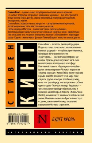 В заглавной повести “Будет кровь” полюбившаяся многим героиня “Чужака” и трилогии “Мистер Мерседес” Холли Гибни после ужасного взрыва в школе понимает, что в мире существуют и другие монстры, подобные чужаку, но на этот раз ей предстоит встретиться со Злом один на один.