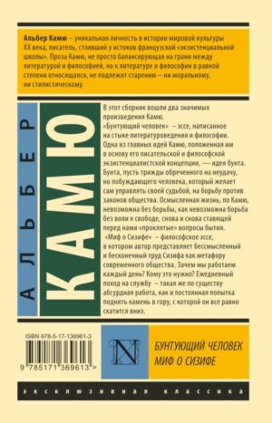 «Миф о Сизифе» — философское эссе, в котором автор представляет бессмысленный и бесконечный труд Сизифа как метафору современного общества. Зачем мы работаем каждый день? Кому это нужно? Ежедневный поход на службу — такая же по существу абсурдная работа, как и постоянная попытка поднять камень в гору, с которой он все равно скатится вниз.