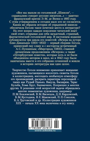«Все мы вышли из гоголевской „Шинели“, — справедливо говорят русские писатели… » — заметил французский критик Э.-М. де Вогюэ в 1885 году. С этим утверждением и сегодня мало кто не согласится. Каким же образом история об украденной шинели обеспечила Гоголю такое почетное место в литературе? На этот вопрос каждое поколение читателей ищет свой ответ, открывая для себя загадочный, странный, фантастический гоголевский мир. В настоящем издании публикуются три цикла его повестей: «Вечера на хуторе близ Диканьки» (1831–1832) — первый сборник Гоголя, принесший ему славу и с восторгом встреченный А. С. Пушкиным; «Миргород» (1835), ставший органичным продолжением «Вечеров»; а также «Петербургские повести», которые, хоть и не были объединены автором в цикл, но в 1842 году были напечатаны вместе в его собрании сочинений и вошли в историю литературы как одно целое. В издание включены иллюстрации художников XIX — начала ХХ века: П. М. Боклевского, В. М. Васнецова, Д. Н. Кардовского, Б. М. Кустодиева, В. Е. Маковского, П. П. Соколова, К. А. Трутовского и др.