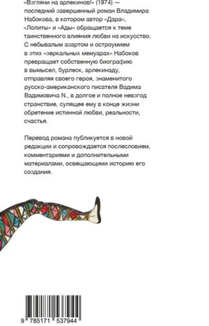 В своем последнем завершенном романе «Взгляни на арлекинов!» (1974) автор «Дара», «Лолиты» и «Ады» обращается к теме таинственного влияния любви на искусство. С небывалым азартом и остроумием в своих зеркальных мемуарах Набоков превращает собственную биографию в вымысел, бурлеск, арлекинаду, отправляя своего героя, знаменитого русско-американского писателя Вадима Вадимовича N., в долгое и полное невзгод странствие, сулящее ему в конце жизни обретение истинной любви, реальности, счастья.