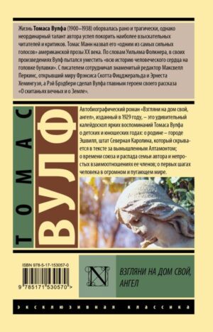 Автобиографический роман «Взгляни на дом свой, ангел», изданный в 1929 году, — это удивительный калейдоскоп ярких воспоминаний Томаса Вулфа о детских и юношеских годах: о родине — городе Эшвилл (штат Северная Каролина), который скрывается в тексте за вымышленным Алтамонтом; о времени союза и распада семьи автора и непростых взаимоотношениях ее членов; о первых шагах человека в огромном и пугающем мире.