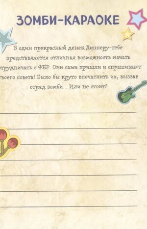 Если загадки, приключения, риск и юмор — синонимы твоей жизни, скорее открывай этот фанбук! Под обложкой тебя ждут Диппер, Мэйбл, дядя Стен и даже создатели сериала! Ты можешь присоединиться к любому из них, прокачать интеллект, творчество и интуицию и просто повеселиться от души. Раскрась гору гномов, сделай крутое селфи с главными героями, напряги извилины, чтобы ответить на супервопросы по сериалу! Билл Шифр, Зус — проверь, что ты не знал о них, ищи анкеты на них внутри! А если хочешь, то можешь поработать один день в Хижине Чудес, для этого тебе нужно нарисовать свой бейджик сотрудника! Улетная программа уже начинается, вперед!