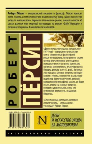 «Дзэн и искусство ухода за мотоциклом» (1974 год) – совершенно уникальная книга, современный философский роман-путешествие. Автор делится с нами своими впечатлениями от поездки на мотоцикле вместе со своим маленьким сыном, из Миннеаполиса в Сан-Франциско. Поездка длилась всего 17 дней. Во время этой поездки, которую читатель совершит вместе с героем, он окунется в захватывающий мир различных учений, религий, направлений философской мысли, он будет искать ответы на главные вопросы, попадет в удивительную, ни на что не похожую реальность, созданную Пёрсигом. . .”Единственный мотоцикл, который стоит чинить, – это вы сами” – утверждает Роберт Пёрсиг.