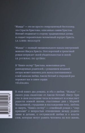 В этой книге два романа, и оба о любви. “Жажда” — своего рода евангелие от Амели Нотомб. Иисус Христос в свои последние часы вспоминает и осмысляет радости земной жизни, счастливые дни с Марией Магдалиной, страдания и наслаждения тела, любовь и смерть. “Книга сестер” — семейный роман с “сюрпризами” о непростых отношениях между родителями и детьми, о сестринской любви и о власти слов, которые могут ранить человека на всю жизнь.