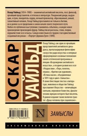 Оскар Уайльд, как один из ярчайших представителей английского декаданса, пропагандировал философию «искусство ради искусства» и впервые сформулировал основные положения своей эстетической программы в лекции «Возрождение английского искусства», а позднее развил их в эссе «Упадок лжи», «Перо, полотно, отрава», «Критик как художник», «Истина масок», объединенных в 1891 году в цикл «Замыслы». В своих блестящих текстах о литературе, живописи и обществе Уайльд прославляет Искусство – величайшую святыню, верховное божество, фанатическим жрецом которого был писатель. В данное издание также включен трактат «Душа человека при социализме».