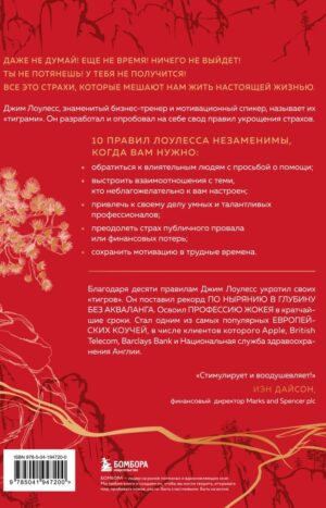 Жить легко и свободно нам мешают наши страхи. Они, словно тигры, рычат: “даже не думай пробовать”, “откажись, все равно ничего не выйдет”, “еще не время”. И мы слушаем. И мы отступаем. Откладываем свою мечту и жизнь в долгий ящик. Джим Лоулесс – бизнес-тренер, один из самых популярных европейских мотивационных спикеров. В числе его клиентов – Apple, British Telecom, Barclays Bank и Национальная служба здравоохранения Англии. Стал первым британским фридайвером, установившим рекорд по нырянию в глубину без акваланга. За 12 месяцев освоил профессию жокея. Всего этого он добился благодаря 10 правилам, которые сам изобрел и опробовал на себе.