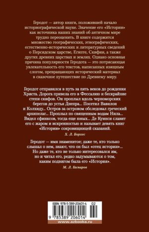 Геродот — автор книги, положившей начало историографической науке. Значение его «Истории» как источника*наших знаний об античном мире трудно переоценить. В книге содержится множество географических, этнографических, естественно-исторических и литературных сведений о Персидском царстве, Египте, Скифии, а также других царствах и землях, в которых обрела свое рождение и смысл культура Западного мира. Однако основная причина неувядающей популярности Геродота — потрясающая увлекательность его текстов, написанных изящным слогом, превращающих исторический материал в сказочное путешествие по Древнему миру.