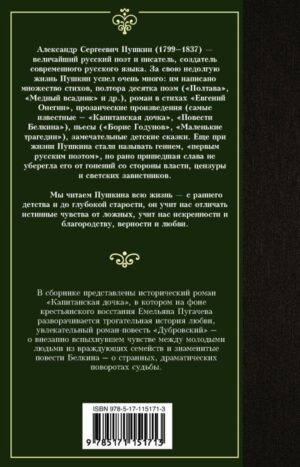 В сборнике представлены исторический роман «Капитанская дочка”, в котором на фоне крестьянского восстания Емельяна Пугачева разворачивается трогательная история любви, увлекательный роман-повесть «Дубровский» – о внезапно вспыхнувшем чувстве между молодыми людьми из враждующих семейств, и знаменитые повести Белкина – о странных, драматических поворотах судьбы.