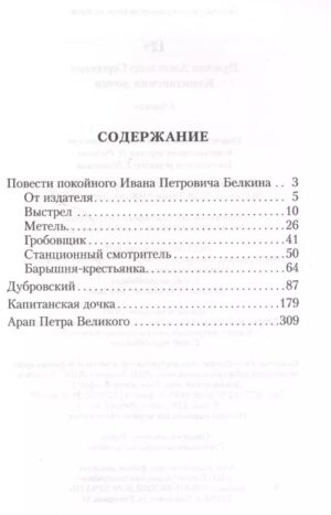 “Повести Белкина” – цикл из пяти повестей. Временами – трагические, временами – забавные, а порой даже мистические, они рассказывают нам истории о любви, мести, одиночестве, о поиске смысла жизни. “Дубровский” – увлекательный роман-повесть о внезапно вспыхнувшем чувстве между потомками двух враждующих семейств. “Капитанская дочка” – исторический роман, в котором на фоне крестьянского восстания Емельяна Пугачева разворачивается трогательная история любви. И наконец, неоконченное произведение “Арап Петра Великого” – первая попытка наиболее полно описать время правления Петра I, а также рассказ о судьбе предка Пушкина Абрама Петровича Ганнибала.