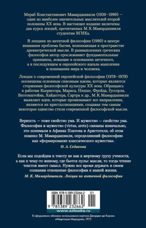 Мераб Константинович Мамардашвили (1930–1990) — один из наиболее значительных мыслителей второй половины ХХ века. В настоящее издание включены два курса лекций, прочитанных М. К. Мамардашвили студентам ВГИКа. В лекциях по античной философии (1980) в центре внимания проблема бытия, возникающая в пространстве древнегреческой мысли. В размышлениях греческих философов автор прослеживает фундаментальные принципы, лежащие в основаниях античного, а в последующем и европейского идеала мышления и понимания мира и человека. Лекции о современной европейской философии (1978–1979) посвящены основным сквозным идеям, которые являются стержнями философской культуры ХХ века. Обращаясь к работам Кьеркегора, Маркса, Ницше, Фрейда, Гуссерля, Витгенштейна, Хайдеггера, Сартра и др., М. К. Мамардашвили выявляет идеи, которые пронизывают все направления, являются их кристаллизациями, создавая тем самым некоторое единство стиля современной философской мысли.