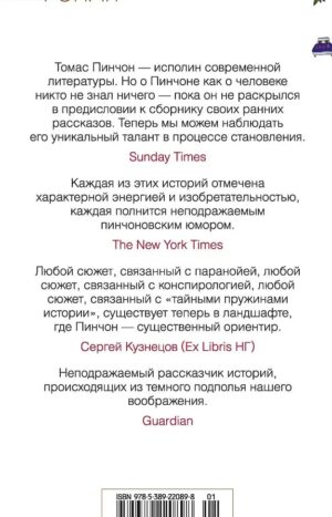 Томас Пинчон — наряду с Сэлинджером, «великий американский затворник», один из крупнейших писателей мировой литературы XX, а теперь и XXI века, после первых же публикаций единодушно признанный классиком уровня Набокова, Джойса и Борхеса. Герои Пинчона традиционно одержимы темами вселенского заговора и социальной паранойи, поиском тайных пружин истории. В сборнике ранней прозы «неподражаемого рассказчика историй, происходящих из темного подполья нашего воображения» (Guardian) мы наблюдаем «гениальный талант на старте» (New Republic). Более того, книга содержит, пожалуй, единственное развернутое прямое высказывание знаменитого затворника: «О Пинчоне как о человеке никто не знал ничего — пока он не раскрылся в предисловии к сборнику своих ранних рассказов» (Sunday Times). Переводы публикуются в новой редакции, авторское предисловие — впервые на русском.