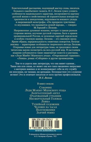 «Он прекрасно чувствовал то неуловимое, что называется „душой народа“», — сказал М. Горький об авторе знаменитых «Левши», «Очарованного странника», «Леди Макбет Мценского уезда». Самобытный талант Лескова заставляет задуматься о загадочной русской душе, о парадоксах и противоречиях национального характера. Напряженные духовные искания, интерес к самым разным сторонам жизни, глубинное знание быта, бесконечное разнообразие сюжетов и ситуаций — все эти черты творчества Лескова нашли отражение в произведениях, включенных в настоящий сборник. Открывая новые для литературы темы, Лесков предложил своим читателям заново посмотреть на весь русский мир.