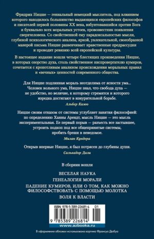 Фридрих Ницше — гениальный немецкий мыслитель, под влиянием которого находилось большинство выдающихся европейских философов и писателей первой половины ХХ века, взбунтовавшийся против Бога и буквально всех моральных устоев, провозвестник появления сверхчеловека. Со свойственной ему парадоксальностью мысли, глубиной психологического анализа, яркой, увлекательной, своеобразной манерой письма Ницше развенчивает нравственные предрассудки и проводит ревизию всей европейской культуры. В настоящее издание вошли четыре блестящих произведения Ницше, в которых озорство духа, столь свойственное ниспровергателю кумиров, сочетается с кропотливым анализом происхождения моральных правил и «вечных» ценностей современного общества.