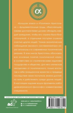 “Большая этика” и “Политика” Аристотеля — фундаментальные труды, объясняющие, какими достоинствами должен обладать каждый гражданин, чтобы его страна была благополучной, а отдельные поступки служили счастью других людей. Тонкие аналитические наблюдения великого систематизатора науки актуальны и в современных политических реалиях. В этих книгах Аристотель обосновал все основные понятия политической науки, в соответствии со стратегическими задачами государства и общества. Для него этическое неотделимо от политического, только воспитав в себе гражданское мужество и предвидя последствия своих поступков, можно достойно жить и действовать среди других людей. В настоящее издание вошли фрагменты работ древнегреческого философа с комментариями специалиста.