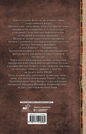 Одна из лучших фэнтези-саг за всю историю существования жанра. Оригинальное, масштабное эпическое произведение, одновременно и свободное от влияния извне, и связанное с классической мифологической, легендарной и сказовой традицией. Шедевр не только писательского мастерства Анджея Сапковского, но и переводческого искусства Евгения Павловича Вайсброта. “Сага о Геральте” – в одном томе. Бесценный подарок и для поклонника прекрасной фантастики, и для ценителя просто хорошей литературы. Перед читателем буквально оживает необычный, прекрасный и жестокий мир литературной легенды, в котором обитают эльфы и гномы, оборотни, вампиры и “низушки”-хоббиты, драконы и монстры, – но прежде всего ЛЮДИ. Очень близкие нам, понятные и человечные люди – такие как мастер меча ведьмак Геральт, его друг, беспутный менестрель Лютик, его возлюбленная, прекрасная чародейка Йеннифэр, и приемная дочь – безрассудно отважная юная Цири…