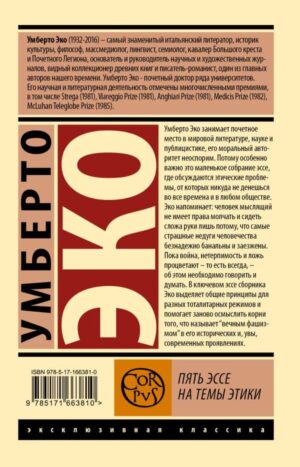 В российской традиции нацизм зовется “фашизмом”. Умберто Эко, культуролог, публицист и философ, не оспаривает терминологический разнобой. Наоборот, в ключевом эссе сборника он выделяет общие принципы для разных тоталитарных режимов и помогает заново осмыслить корни того, что называет “вечным фашизмом” в его исторических и, увы, современных проявлениях. Эта подборка эссе дает повод к размышлениям о ненависти, о войне, о религии — размышлениям, объединяющим тех, кому мир небезразличен, тех, кто сознает, что победа разума над регрессом никогда не окончательна и что внутренняя работа для каждого из нас всегда обязательна. Мораль ли, этика, совесть ли, нравственность, гражданственность — различие опять же только в терминах. Суть же одна: уроки истории полезны, лишь если люди не ленятся обдумывать их. А умственный труд бок о бок с Эко обычно не в тягость, беседа с ним — и радость, и развлечение.