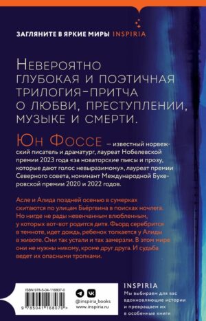 Невероятно глубокая и поэтичная трилогия-притча о любви, преступлении, музыке и смерти. «Трилогия» состоит из трех повестей, которые считаются едва ли не самыми важными произведениями Фоссе — «Без сна», «Сны Улава» и «Вечерняя вязь».