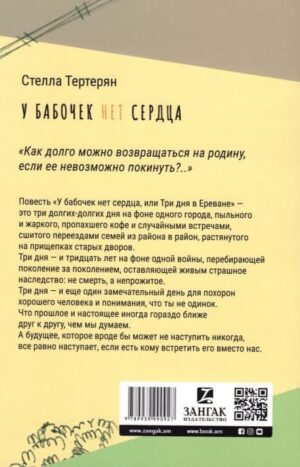 «Թիթեռները սիրտ չունեն կամ Երեք օր Երևանում» վիպակը երեք երկա՜ր-երկար օր է մի փոշոտ ու տոթ քաղաքում՝ համեմված սուրճի բույրով ու պատահական հանդիպումներով, կարված թաղից թաղ ընտանիքների տեղափոխումներով ու լվացքի սեղմակների վրա ձգված հին բակերով: