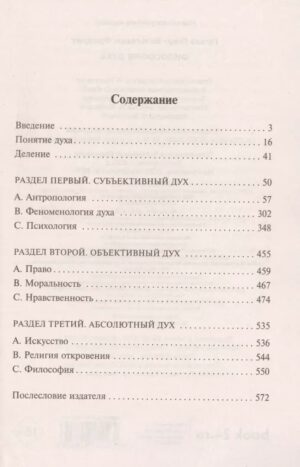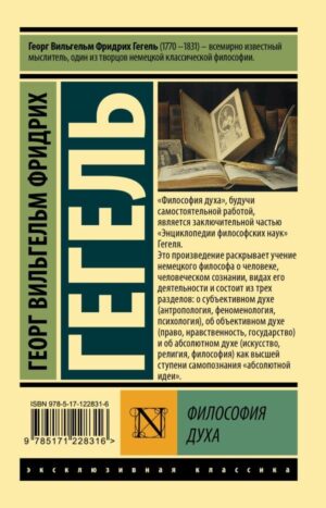 Это произведение раскрывает учение немецкого философа о человеке, человеческом сознании, видах его деятельности и состоит из трех разделов: о субъективном духе (антропология, феноменология, психология), об объективном духе (право, нравственность, государство) и об абсолютном духе (искусство, религия, философия) как высшей ступени самопознания “абсолютной идеи”.