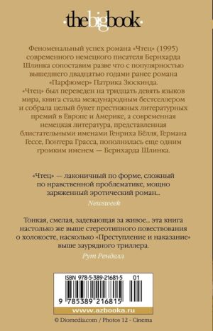 Феноменальный успех романа современного немецкого писателя Бернхарда Шлинка «Чтец» (1995) сопоставим разве что с популярностью вышедшего двадцатью годами ранее романа Патрика Зюскинда «Парфюмер». «Чтец» переведен на тридцать девять языков мира, книга стала международным бестселлером и собрала целый букет престижных литературных премий в Европе и Америке. Внезапно вспыхнувший роман между пятнадцатилетним подростком, мальчиком из профессорской семьи, и зрелой женщиной так же внезапно оборвался, когда она без предупреждения исчезла из города. Через восемь лет он, теперь уже студент выпускного курса юридического факультета, снова увидел ее — среди бывших надзирательниц женского концлагеря на процессе против нацистских преступников. Но это не единственная тайна, которая открылась герою романа Бернхарда Шлинка «Чтец».