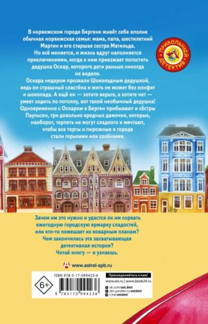 В норвежском городе Бергене живёт себе вполне обычная норвежская семья: мама, папа, шестилетний Мартин и его старшая сестра Матильда. Но всё меняется, и жизнь вдруг наполняется приключениями, когда к ним приезжает погостить дедушка Оскар, которого дети раньше никогда не видели. Оскара недаром прозвали Шоколадным дедушкой, ведь он страшный сластёна и жить не может без конфет и шоколада. А ещё он — хотите верьте, а хотите нет — умеет ходить по потолку, вот такой необычный дедушка! Одновременно с Оскаром в Берген прибывают и сёстры Паульсен, три довольно вредных дамочки, которые, наоборот, терпеть не могут сладкого и мечтают, чтобы все торты и пирожные в городе стали горькими или солёными. Зачем им это нужно и удастся ли им сорвать ежегодную городскую ярмарку сладостей, или кто-то помешает их коварным планам? Чем закончилась эта захватывающая детективная история? Читай книгу — и узнаешь.