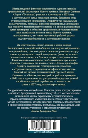 Нидерландский философ-рационалист, один из главных представителей философии Нового времени, Бенедикт Спиноза (Барух д’Эспиноза) родился в Амстердаме в 1632 году в состоятельной семье испанских евреев, бежавших сюда от преследований инквизиции. Оперируя так называемым геометрическим методом, философ рассматривал мироздание как стройную математическую систему и в своих рассуждениях сумел примирить и сблизить средневековый теократический мир незыблемых истин и науку Нового времени, постановившую, что лишь неустанной работой разума под силу приблизиться к постижению истины. За «еретические» идеи Спиноза в конце концов был исключен из еврейской общины, где получил образование, и в дальнейшем, хотя его труды и снискали уважение в кругу самых просвещенных людей его времени, философ не имел склонности пользоваться благами щедрого покровительства. Единственным сочинением, опубликованным при жизни Спинозы с указанием его имени, стали «Основы философии Декарта, доказанные геометрическим способом» с «Приложением, содержащим метафизические мысли». Главный же шедевр, подытоживший труд всей жизни Спинозы, — «Этика», над которой он работал примерно с 1661 года и где система его рассуждений предстает во всей своей великолепной стройности, — вышел в свет лишь в 1677 году, после смерти автора.