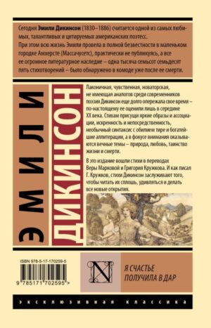 Сегодня Эмили Дикинсон считается одной из самых любимых, талантливых и цитируемых американских поэтесс. При этом всю жизнь Эмили провела в полной безвестности в маленьком городке Амхерсте (Массачусетс), практически не публикуясь, а все ее огромное литературное наследие — одна тысяча семьсот семьдесят пять стихотворений — было обнаружено в комоде уже после ее смерти. Лаконичная, чувственная, новаторская, не имеющая аналогов среди современников поэзия Дикинсон еще долго опережала свое время — по-настоящему ее оценили лишь в середине XX века. Стихам присущи яркие образы и ассоциации, искренность и непосредственность, необычный синтаксис с обилием тире и богатейшие аллитерации, а в фокусе внимания оказываются вечные темы — природа, любовь, таинство жизни и смерти. В это издание вошли стихи в переводах Веры Марковой и Григория Кружкова. И как писал Г. Кружков, стихи Дикинсон заслуживают того, чтобы читать их сплошь, удивляться и делать все новые открытия.
