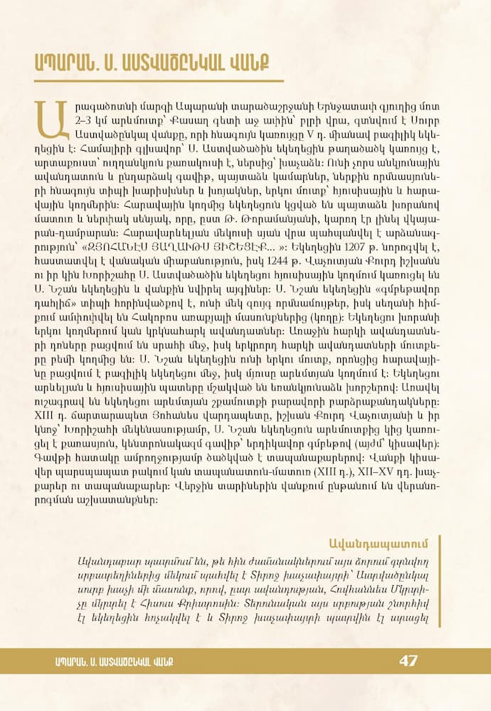 Ընթերցողները գրքի օգնությամբ կարող են մեր հայրենիքի 85 նշանավոր վանքերի ու եկեղեցիների վերաբերյալ հանգամանալից տեղեկություններ ստանալ, ինչպես նաև այդ հուշարձանների հետ կապված ավանդություններ, հրաշագործություններ, ավանդազրույցներ կարդալ կամ այլ լրացուցիչ հետաքրքրաշարժ տեղեկություններ ձեռք բերել, հարստացնել իրենց գիտելիքները:
