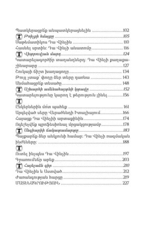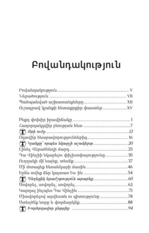 Վերածննդի ամենաինքնօրինակ ստեղծագործող Լեոնարդո դա Վինչիի կենսագրությունն ու արարումները չեն դադարում զարմացնել անգամ 21–րդ դարում։ Այս գիրքը հրաշալի սկիզբ է ծանոթանալու Դա Վինչիի կյանքի և ստեղծագործության հայտնի և ոչ այնքան հայտնի դրվագներին՝ բացահայտելով նրան ոչ միայն որպես տաղանդավոր նկարչի և արտասովոր անհատականության, այլև արժևորելու նրան որպես երաժիշտ, գիտնական, գյուտարար, կենսաբան, մաթեմատիկոս և այլն։ Փոխանցելով Վերածննդի Իտալիայի արվեստի շունչը՝ գիրքը ոգեշնչում է ընթերցողին հետևելու Դա Վինչիի օրինակին՝ անվերջ սովորել, հետաքրքրվել ամենատարբեր բնագավառներով, չվախենալ փորձարկելուց և, ի վերջո, արարել նորը, լինել բացառիկ։